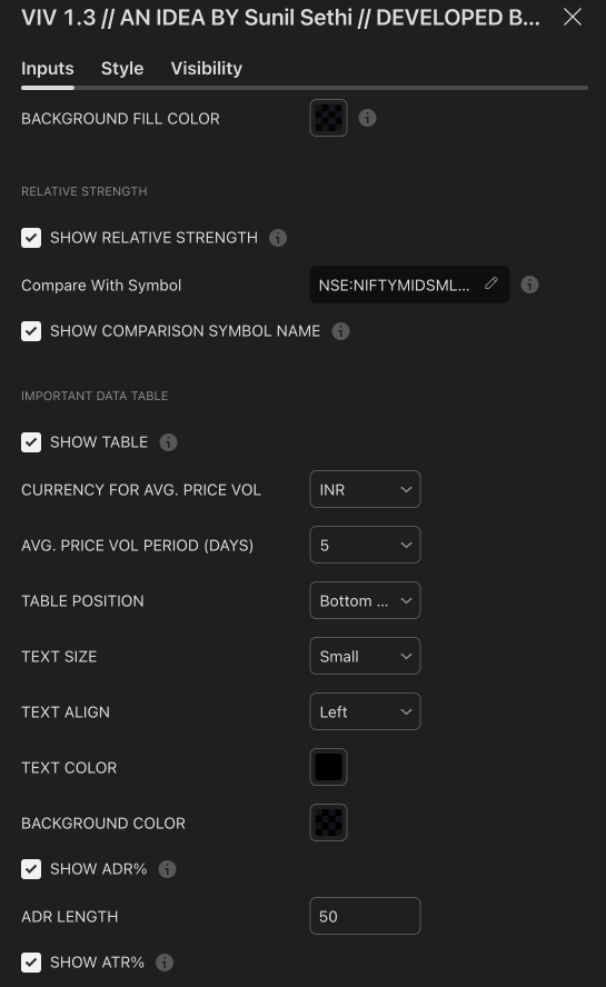 - Average Volume / Price Volume – Customizable average period and currency unit (INR/USD).