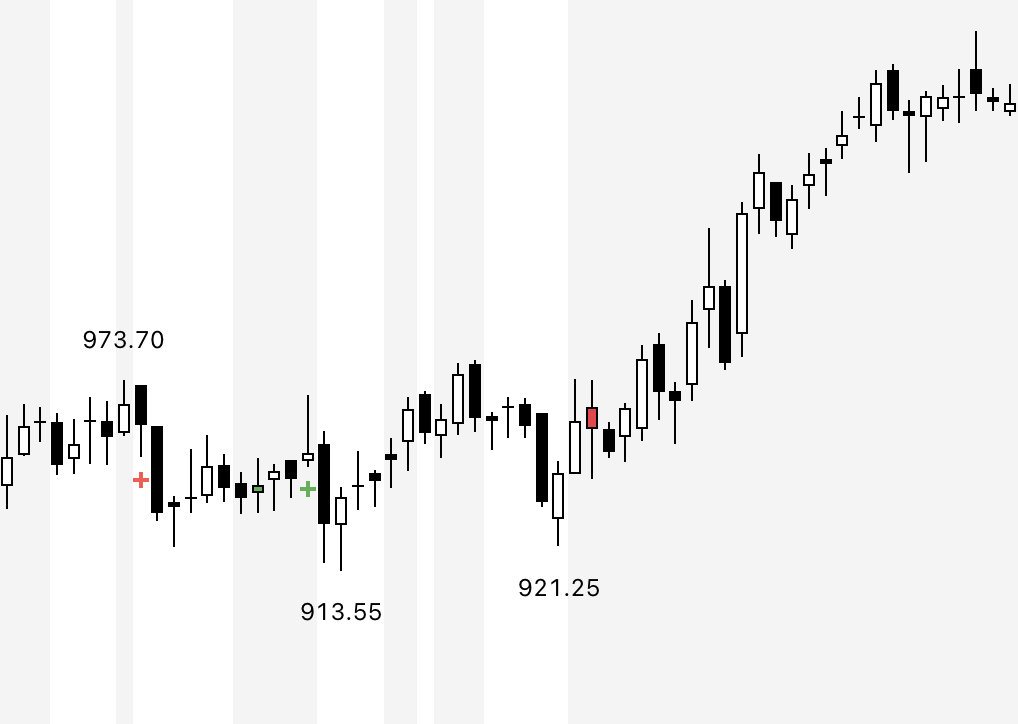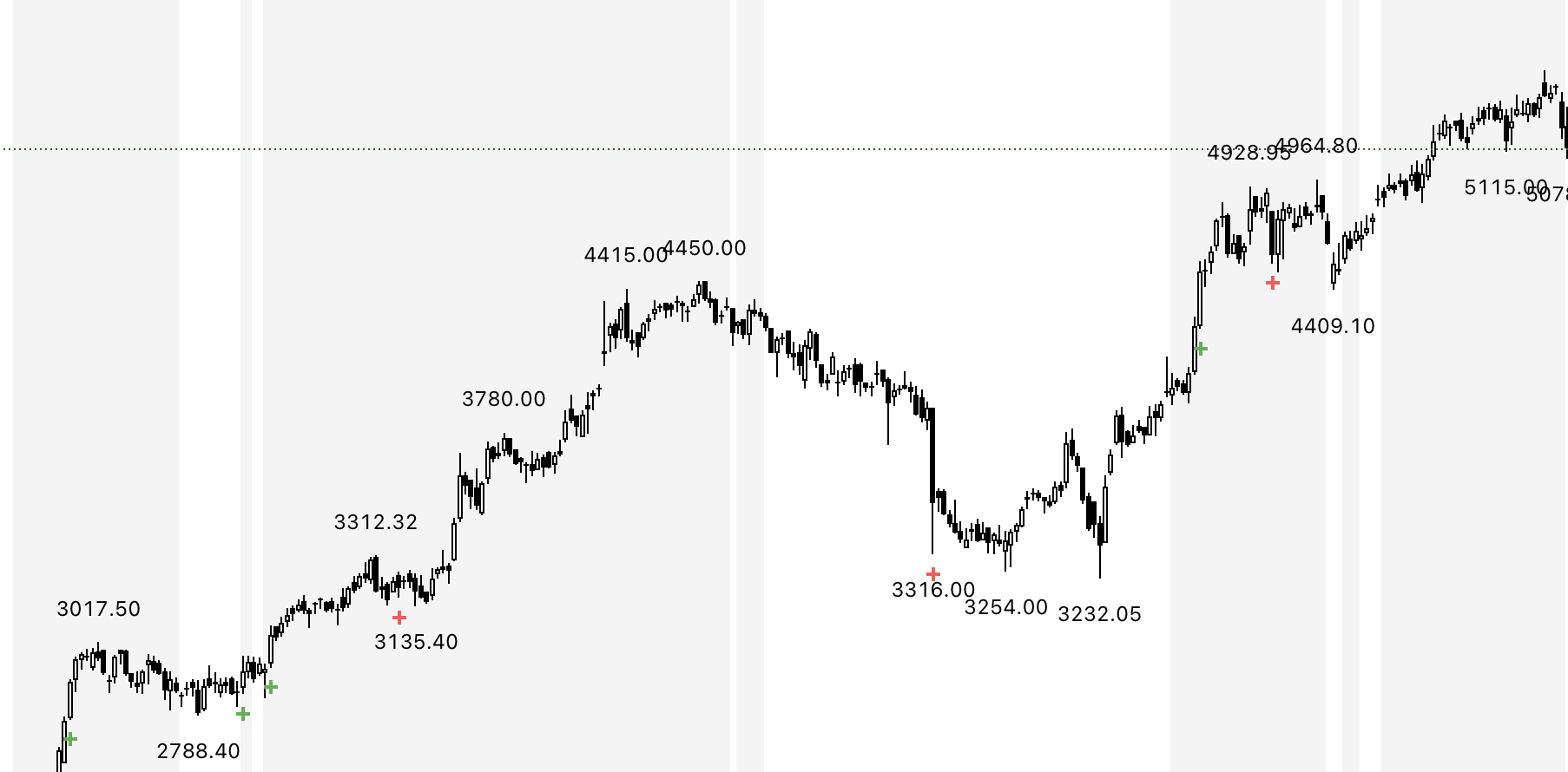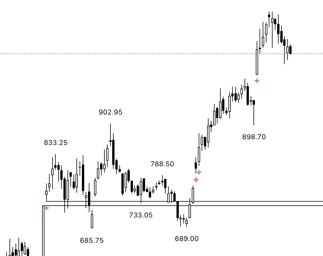 - Watch for old high-volume candles (➕ marks) to plan entries/exits.