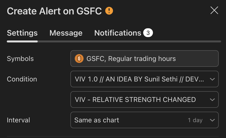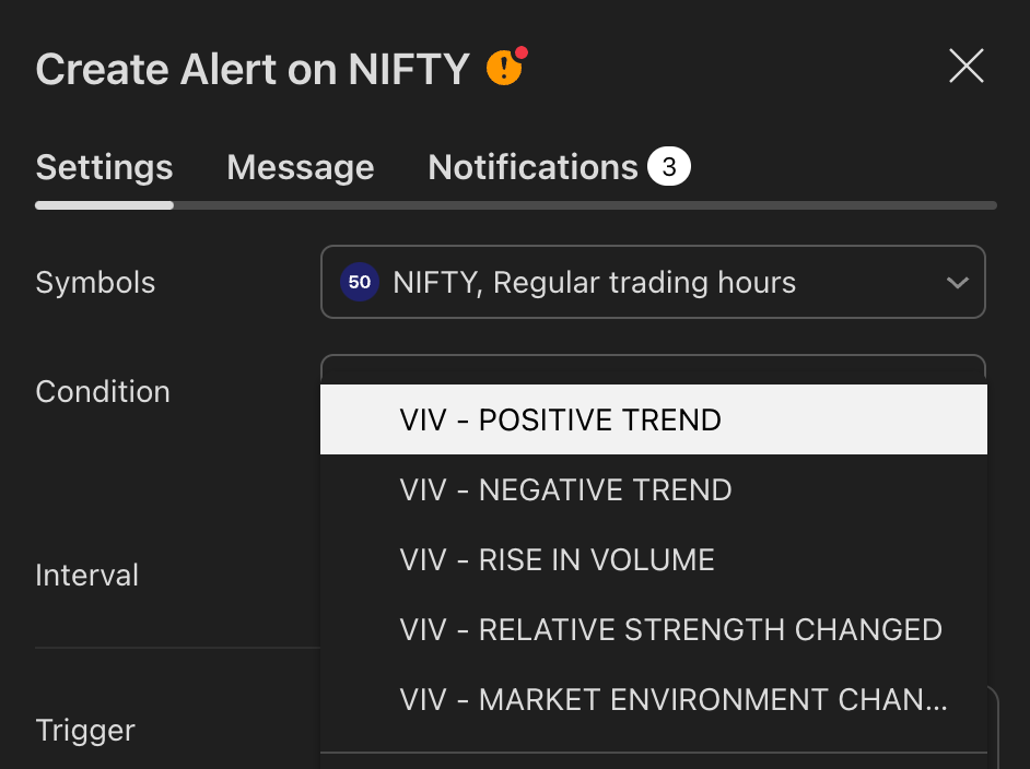 Set your preferred interval and trigger type in TradingView to stay updated without chart-watching.